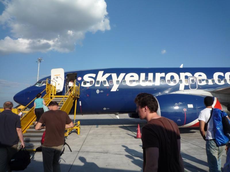 SkyEurope NE3226便搭乗開始. 格安航空会社なのにちゃんと座席指定あり. 80%くらいの搭乗率. 定刻に出発.