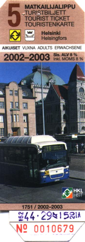 ヘルシンキ中央駅到着. HKL のオフィスで5日間のツーリストチケット(市内のトラム・電車・船が 乗り放題)を購入する.