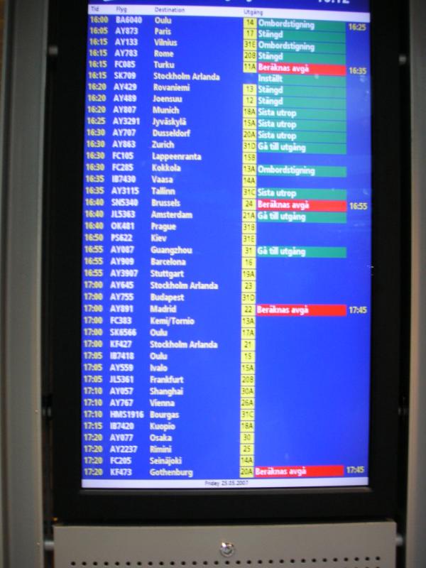 ヘルシンキ・ヴァンター空港到着. マドリッド便への乗り継ぎなので ここで入国手続き. セキュリティチェックで前に並んでいたオッサンが 係員の指示に従わず、時間がかかる. イライラ. マドリッド便の搭乗ゲートで 文庫本を読みながら搭乗開始を待つ. が、しかし、遅延の知らせが流れる 17:00予定が17:45に変更. 実際は18:00くらいになった(バルセロナからの 到着便が遅れたらしい).