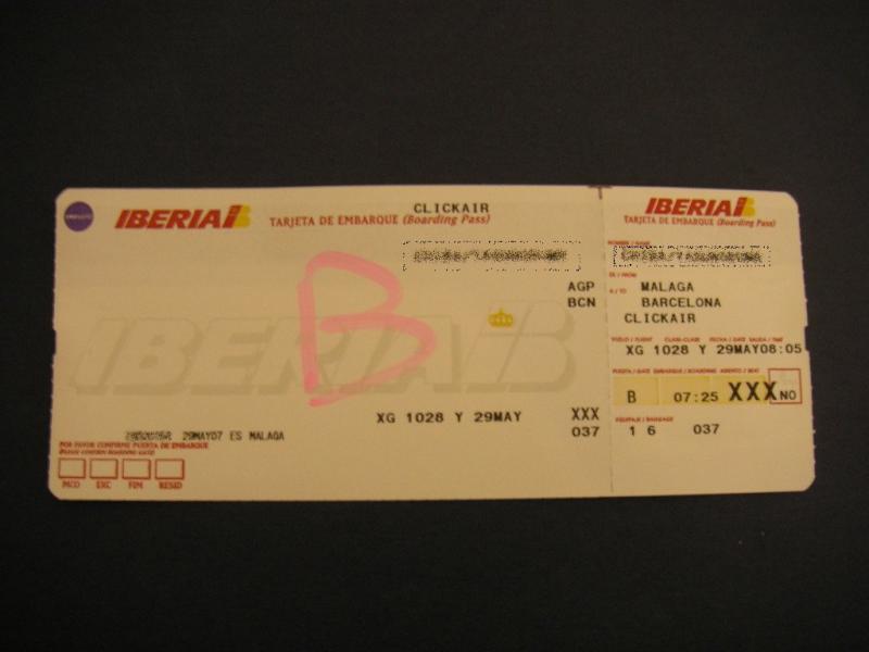 近郊電車でマラガ空港へ. バルセロナに向かうため格安航空会社の Clickairを利用. 格安と言いつつ、Iberiaのオペレーションっぽい. ボーディングパスは、Iberiaのものに、「CLICKAIR」って但し書きしてあるだけ.
